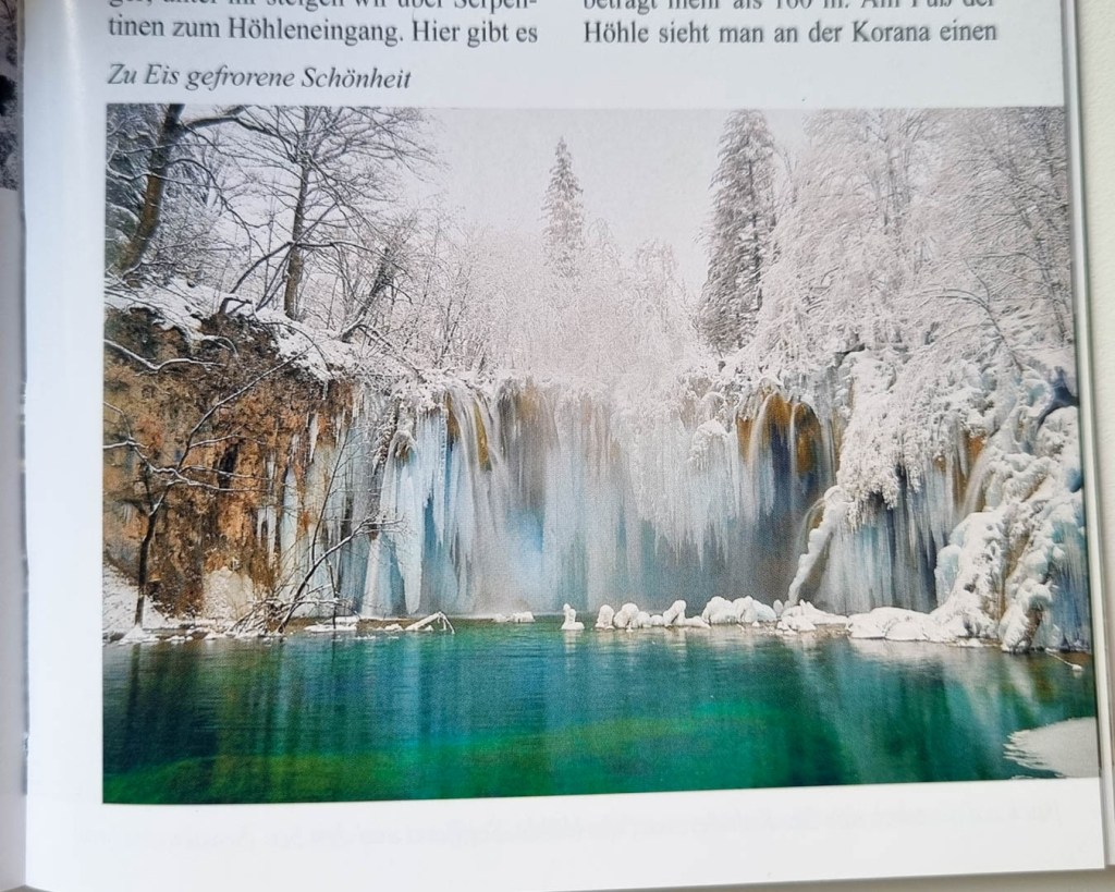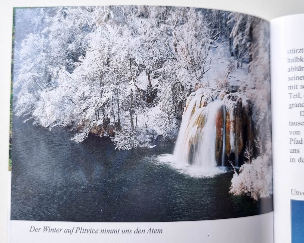 Beinahe verweist ist der Eingangsbereich, wo ein paar Taxis stehen. Wir nehmen einfach eines davon, obwohl ich ein schlechtes Gewissen habe, dass wir „unseren“ Taxifahrer von heute Vormittag nicht angerufen haben. Noch fast zwei Stunden hätten wir bis 20 Uhr einsam und alleine durch den Nationalpark Plitvicer Seen wandern können. Aber wir sind erschöpft und erfüllt. Und am Abend als Bobby sich keinen Zentimeter mehr vom Fleck bewegt und wir unsere müden Beine ins Dachzelt legen, beschließen wir, am nächsten Tag nicht noch einen der Hiking Trails zu gehen, sondern direkt Richtung Adriaküste weiterzufahren. Besser konnte es für diesmal nicht werden im Plitvicer Nationalpark. Aber für mich steht fest: Ich komme wieder, und zwar im Winter. In meinem kleinen Büchlein sind Fotos einer wahren Zauberlandschaft aus Schnee und Eis. Ist das nicht wunderschön?