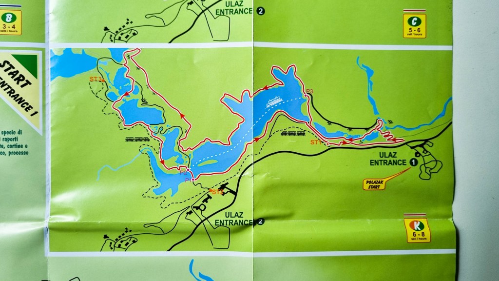 Da der Vormittag mittlerweile fortgeschritten ist, beschließen wir, uns erst heute Abend ganz in Ruhe mit den Wandermöglichkeiten auf den Hiking Trails zu beschäftigen. Unbedingt wollte ich zwar auch diesen unbekannteren und einsameren Teil des Nationalparks Plitvicer Seen kennenlernen, aber noch mehr reizen natürlich die klassischen Highlights. Für heute wählen wir die ausgewiesene Route „K“, die mit 6-8 Stunden die längste aus den acht Besichtigungsprogrammen ist.