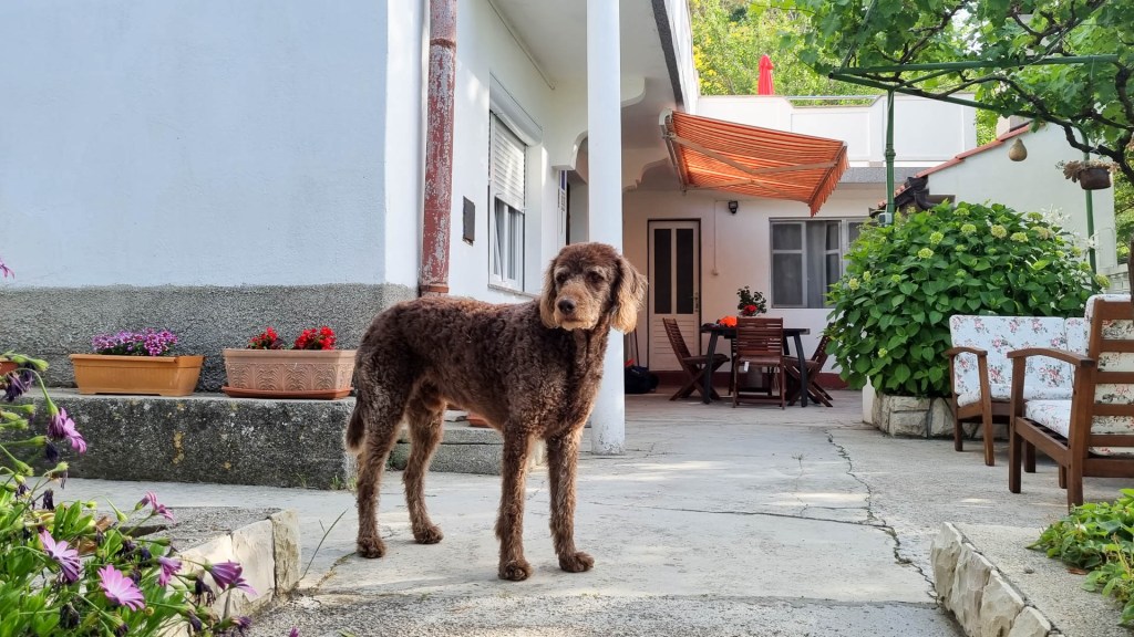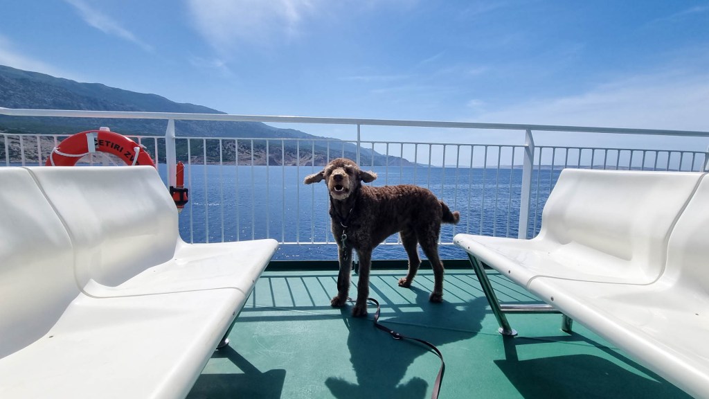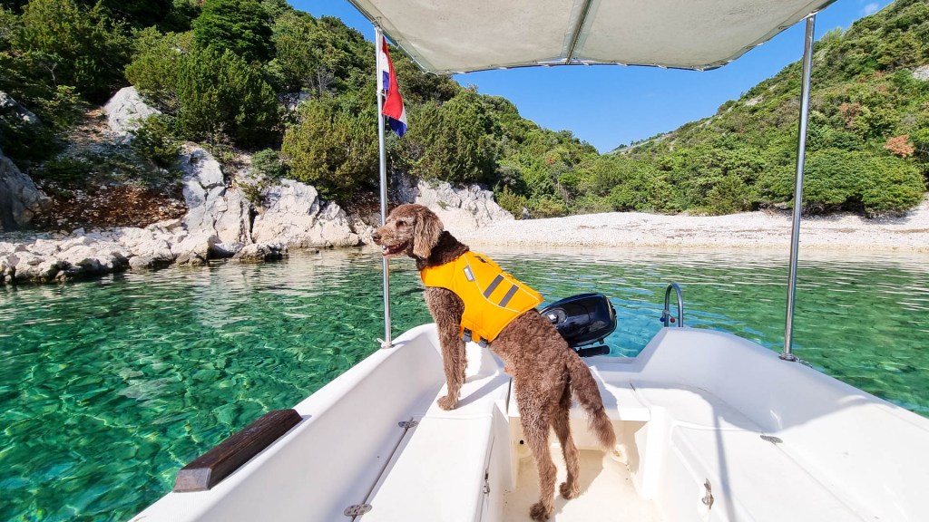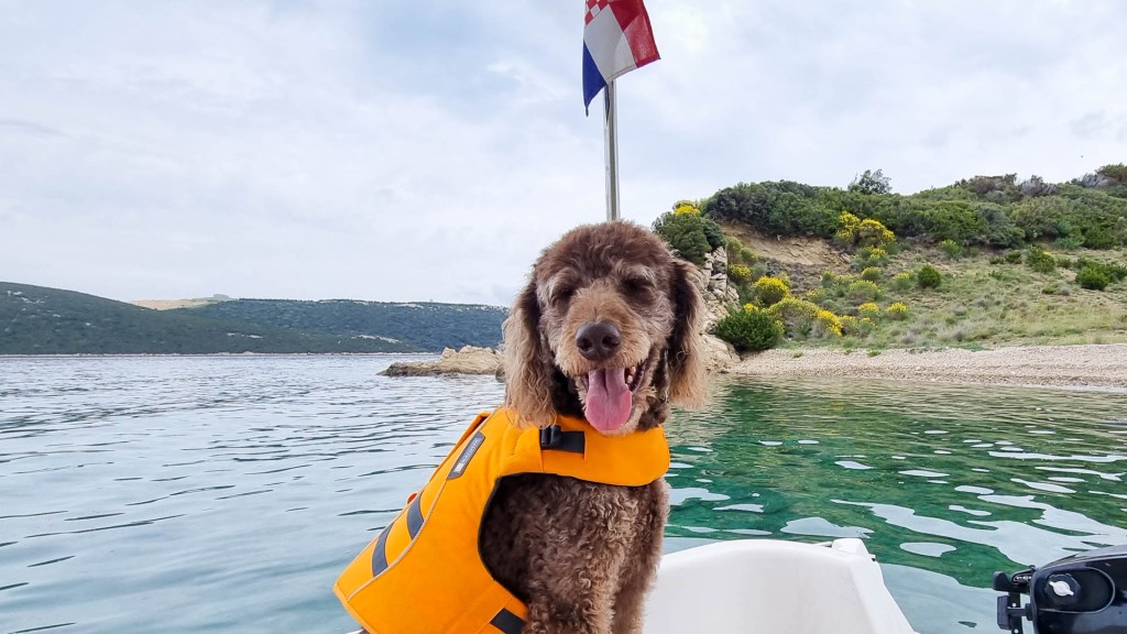 Ganz vorsichtig steigt Bobby vom Steg auf die schmale Reling und dann über das Dach der kleinen Kajüte ins Boot. Es gefällt mir, mit welcher Ruhe er sich mittlerweile auf unbekanntem Terrain bewegt. Ganz anders als früher. Ich möchte gar nicht daran denken, dass er mit seinen acht Jahren langsam alt werden könnte – höchstens etwas vernünftiger. Das Schwanken ist ihm am Anfang gar nicht geheuer aber immer häufiger streckte er seine Nase in den Fahrtwind. An einer der vorgelagerten Inseln von Supertarska Draga ankern wir. Um nichts in der Welt würde Bobby ins Wasser springen. Als wir das (abwechselnd) tun, beschwert er sich lautstark, um uns dann freudestrahlend wieder an Bord zu begrüßen.