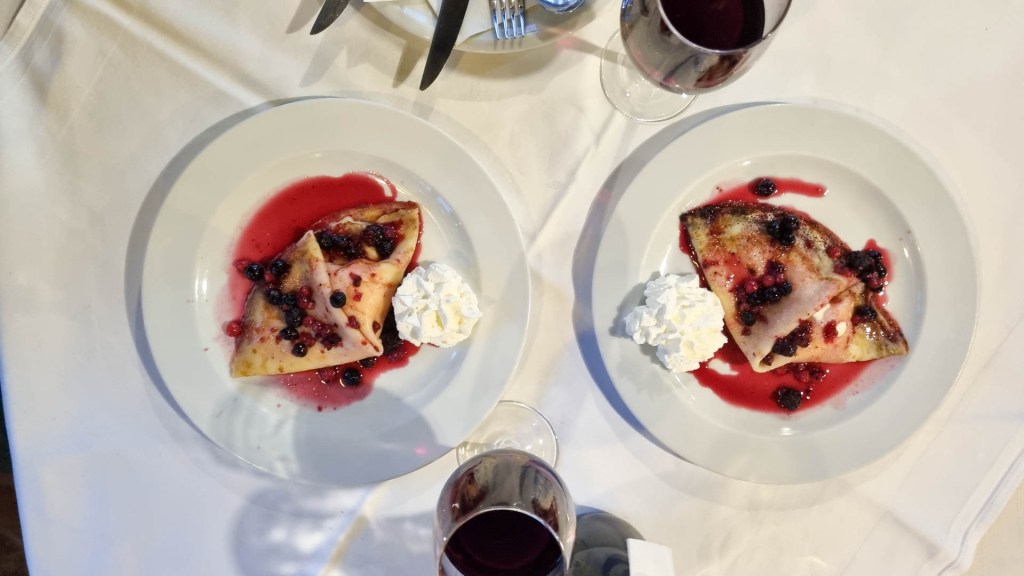 Am Abend regnet es. Wir gehen in die Konoba „Gondola“, direkt am Hafen von Supertarska Draga, wo wir uns nach zwei Tagen bereits als Stammgäste fühlen. Es tut einfach gut, solche Ankerplätze zu haben, besonders wenn der Ausblick auf das Meer so schön und ist, und das Essen so lecker, dass ich prompt meinen Ernährungsplan (kein Getreide, wenig Zucker) über Bord werfe und stattdessen eine neue Regel aufstelle: ein Tag ohne Eis-Palatschinken ist ein verlorener Tag 😉