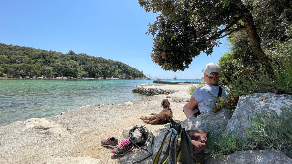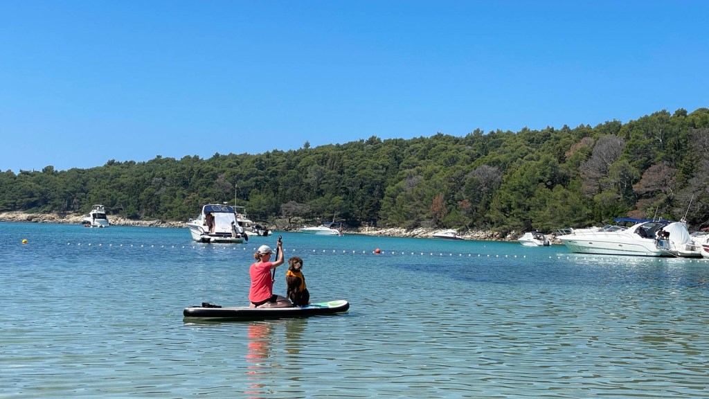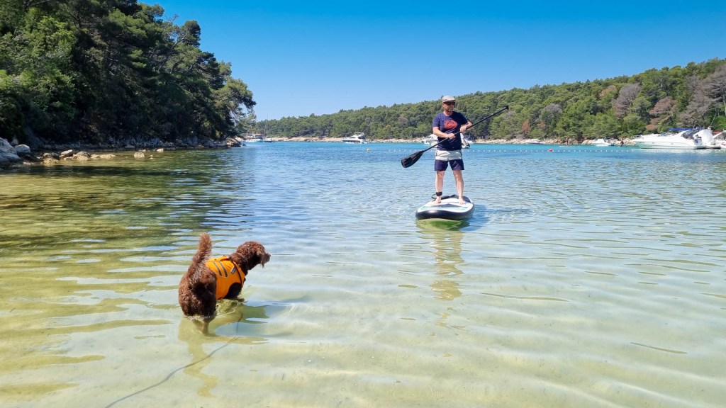 Suha Punta ist bestimmt nicht „einer der schönsten Plätze“ auf der Insel Rab, wie ich es im Reiseführer lese, aber die Halbinsel Kalifront mit ihren unzähligen Buchten ist es bestimmt schon. Deswegen verbringen wir auch die letzten Tage ausschließlich dort. Die kleine Bucht Cifnata, die auch (mal wieder) „Paradiesbucht“ genannt wird haben wir beinahe für uns allein. Endlich lassen wir unser SUP zu Wasser. Erst ich, dann Wolfgang, und dann alle gemeinsam mit Bobby paddeln wir durch unser kleines Paradies.