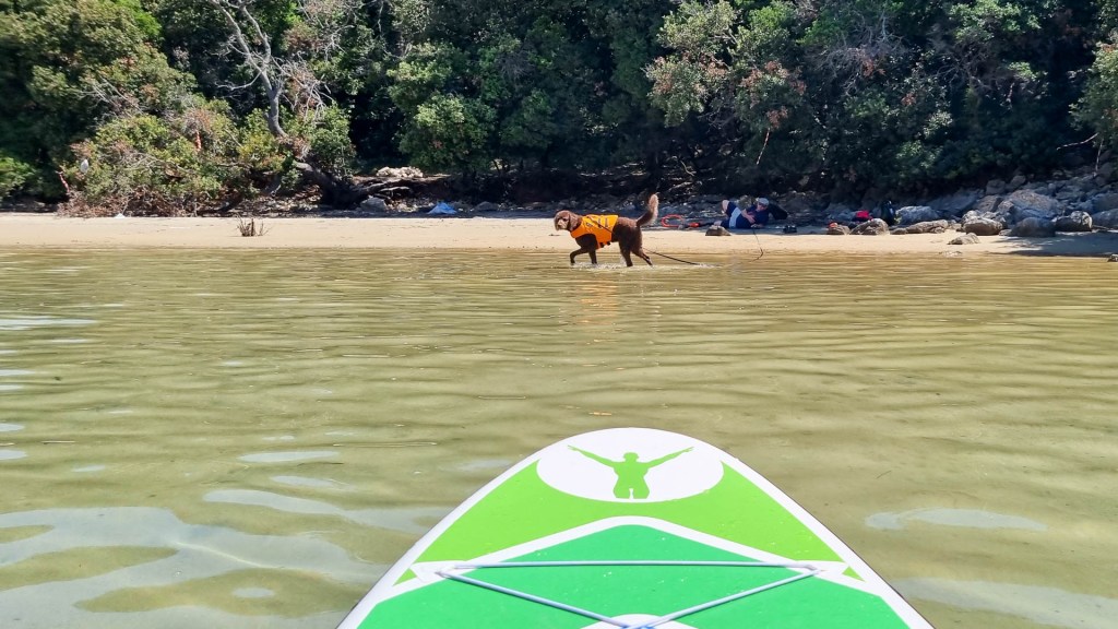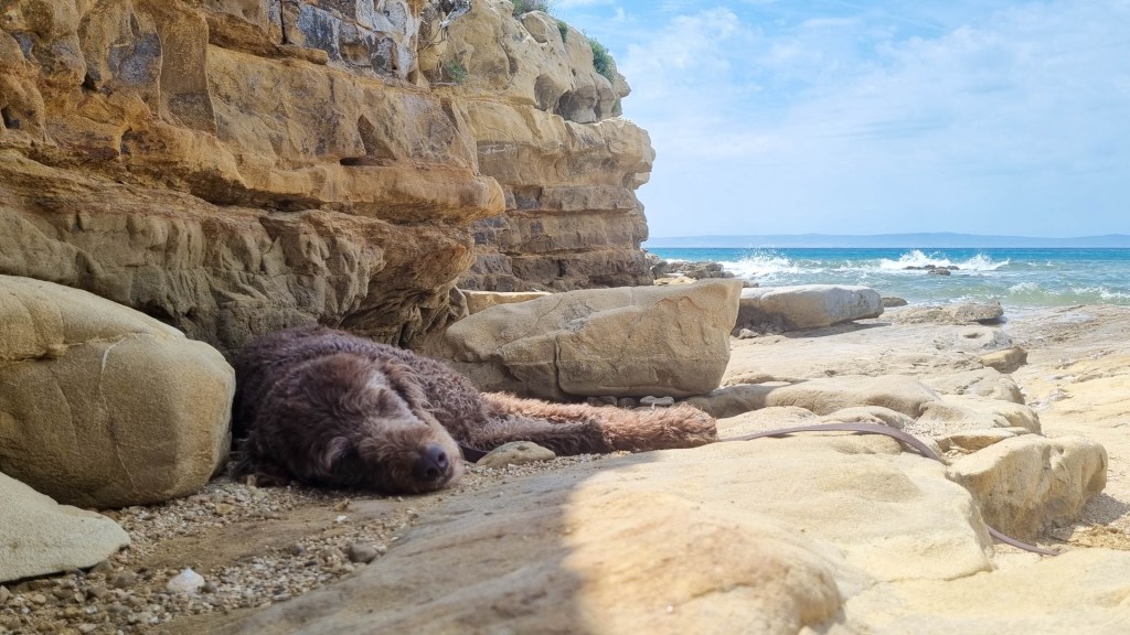Einige Boote ankern über den Tag in der Bucht. Mit kleinen Schlauchbooten oder schwimmend kommen die Leute, viele auch mit ihren Hunden, an Land, um sich kurz die Beine zu vertreten und sich dann in den warmen Sand zu legen. Einmal kommt eine riesige Wandergruppe aus dem Dundo. „Badestopp“ ruft der Lehrer und 30 Jugendliche stürzen sich lauthals ins Meer. Das ist der Moment als es Bobby zu viel wird. Laut bellend will er dieses Chaos beseitigen. Ich drehe eine kleine Runde durch den Wald mit ihm und als wir nach einer halben Stunde wiederkommen, ist wieder Ruhe im Paradies.
