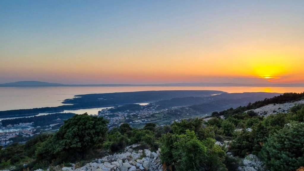 Tief unter uns liegt die Stadt Rab mit seinen vier Kirchtürmen im Abendlicht. Wir blicken weit bis zu dem kleinen Hafen von Supertarska Draga, zu unserem großen Ferienhaus irgendwo in den gelben Ginsterhängen und hinüber zum Paradies und in die Sahara und dem grünen Dundo, bis die Sonne im Meer versinkt und die Insel Rab in orange-rotem Licht leuchtet, bevor die Nacht einbricht.