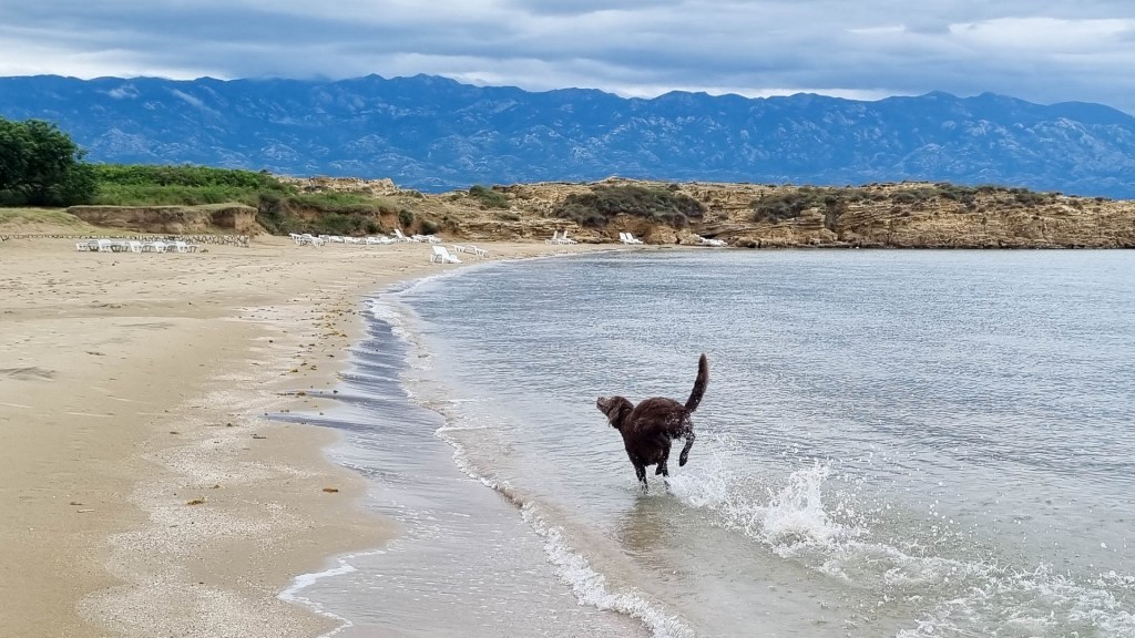 In den nächsten Tagen bringt die Bora tatsächlich unbeständiges und kühleres Wetter mit sich. Wir machen einen Ausflug nach Lopar, wo Karussells aufgebaut und Souvenirbuden bestückt werden. Man bekommt eine Vorahnung, was hier im Sommer los sein wird. Nichts für uns, schon gar nicht mit Hund. Aber jetzt, in der Vorsaison und noch dazu bei wolkenverhangenem Himmel, verirrt sich sogar am Wochenende kaum jemand hierher. Und Bobby ist im „Paradies“ – im wahrsten Sinne des Wortes – er tobt über den angeblich berühmtesten Sandstrand Kroatiens, dem 1,5 km langen Paradiesstrand.