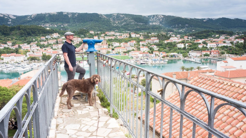 Bevor nach drei Tagen die Bora und die Wolken und damit auch die (angenehm) niedrigen Temperaturen verschwinden, statten wir noch der Inselhauptstadt Rab einen Besuch ab, die durch das Postkartenmotiv, den vier hintereinander gestaffelten Kirchtürmen, berühmt geworden ist. So steht es in unserem Reiseführer, laut dem Rab sogar die „schönste Inselhauptstadt der Kvarner Bucht“ sein soll. Und tatsächlich gibt es viel Historisches zu betrachten und zu bestaunen in den kleinen Gassen der Altstadt. Bobby gefällt es allerdings am besten im großen Stadtpark, von dem aus man durch die alten Bäume aufs Meer blicken kann.