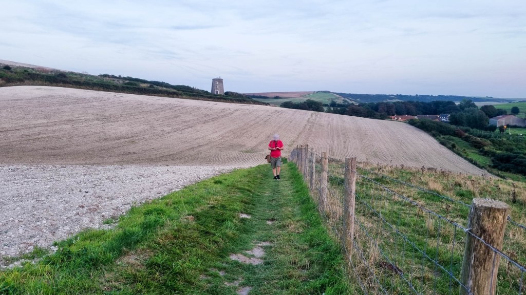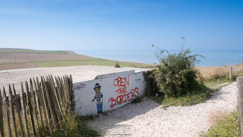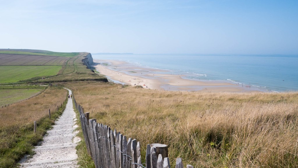 Über weite Felder wandern wir bis auf den Gipfel des Cap de Blanc Nez und blicken in die Ferne, Richtung England. Trotz strahlendem Sonnenschein ist die Luft diesig und der Horizont kaum auszumachen. Die Kanalfähren scheinen irgendwo zwischen Himmel und Meer zu schweben.