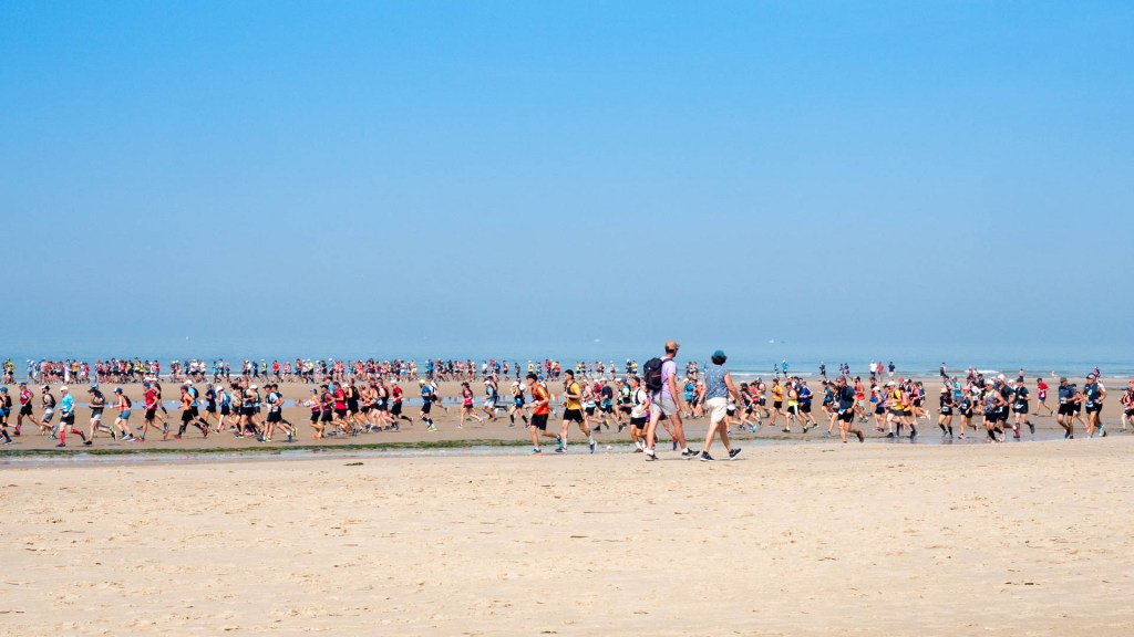 Und an dem riesigen Strand hier an der Côte d’ Opale ist Platz genug für jeden, auch für Hunde. Bobby kann es kaum abwarten, durch das seichte Wasser zu rennen, um die Badenden vor den gefährlichen Fluten zu retten. Irgendwann können wir ihn davon überzeugen, dass das nicht sein Job ist, und es viel interessanter ist, mit uns zu spielen und zu toben, bis eine riesige Walze, bestehend aus hunderten von bunten Punkten, auf uns zurollt. Der Trail de la Côte d’ Opale, ein Ultramarathon startet hier an diesem Strand, lesen wir später. Bobby ist zu perplex, um sich darüber zu beschweren und beobachtet fasziniert die vielen Läuferinnen und Läufer an uns vorbeiziehen. Später suchen wir etwas Schatten und finden zudem Wein, Wurst und Käse in einer Strandbar – ja die Franzosen wissen zu leben – wunderbar ist das.