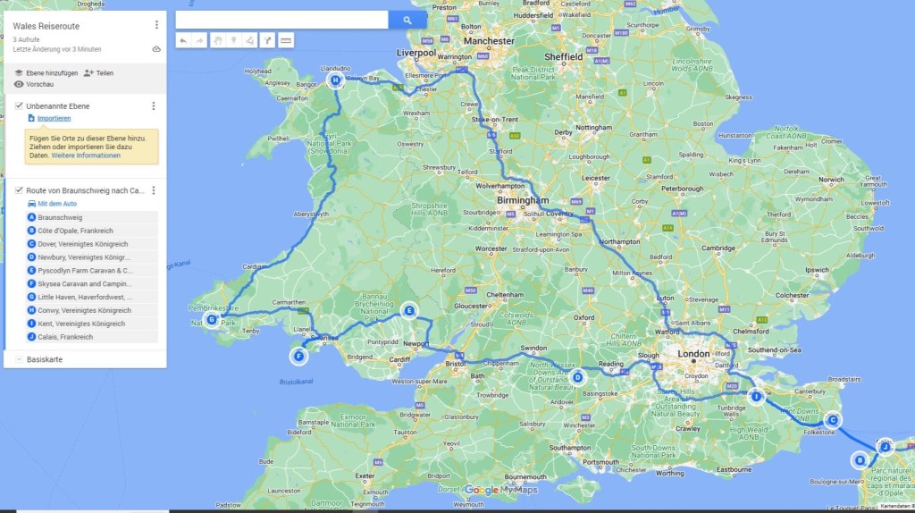 Aber von vorne: Bereits für 2020 geplant, jedoch wegen Corona abgesagt, lagen die Pläne für die Reise nach Wales schon länger in der Schublade: Mit dem Dachzelt über die Côte d’Opale (Frankreich); von Calais mit der Fähre nach Dover; schön langsam durch England Richtung Südwales (Brecon Beacons Nationalpark, Bleanavon Ironworks oder mal schauen); dann eine Woche Pembrokeshire Coast Nationalpark in einem Ferienhaus; anschließend eine Woche Nordwales / Snowdonia Nationalpark in einem Ferienhaus; über England / Kent im Dachzelt und mit der Fähre zurück von Dover nach Calais; gesamte Reisezeit: etwa 3 ½ Wochen.