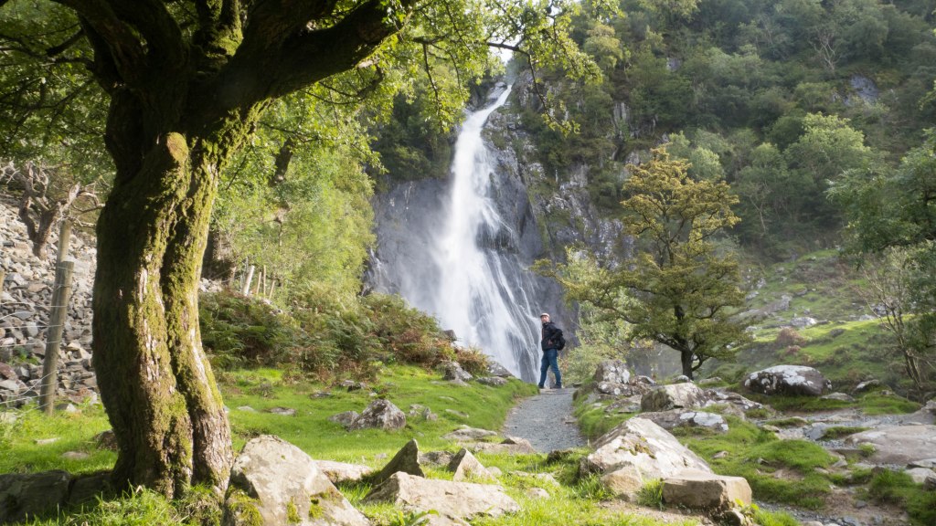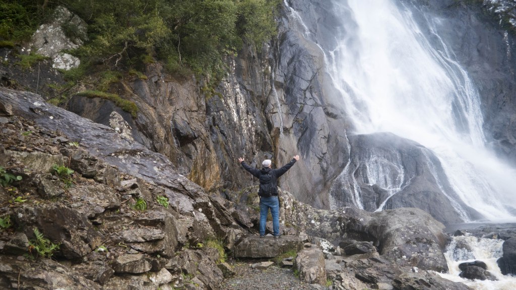 Beinahe wären wir wegen immer noch andauerndem Regen einfach vorbeigefahren. Zum Glück sind wir kurz vor Conwy doch abgebogen, Richtung Aber Falls. Am Wanderparkplatz angekommen, hörte es auf zu regnen. Als etwas später auch noch die Sonne rauskam, schien die Landschaft wie verzaubert – so wie wir auch, von der Schönheit und der Kraft der Natur. Ab diesem Zeitpunkt sollte das Wetter stabil bleiben. Die Zeit für den Eryri Nationalpark war gekommen!