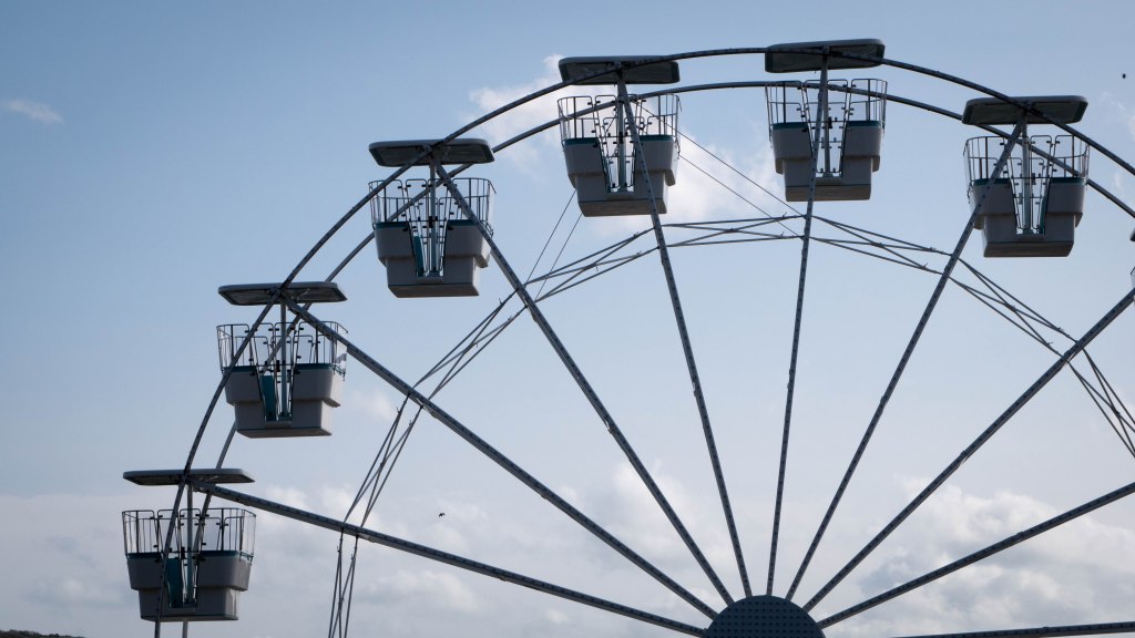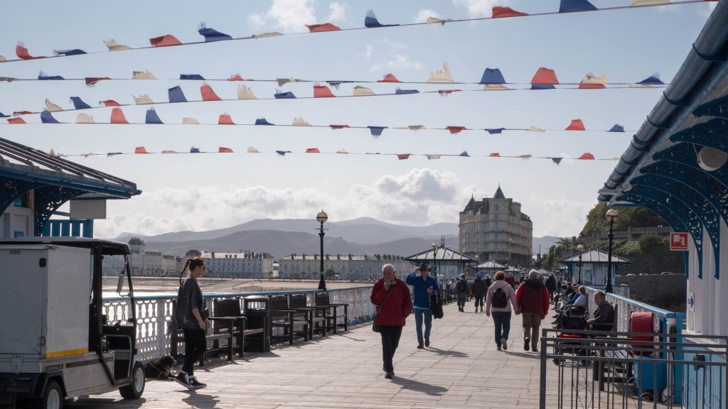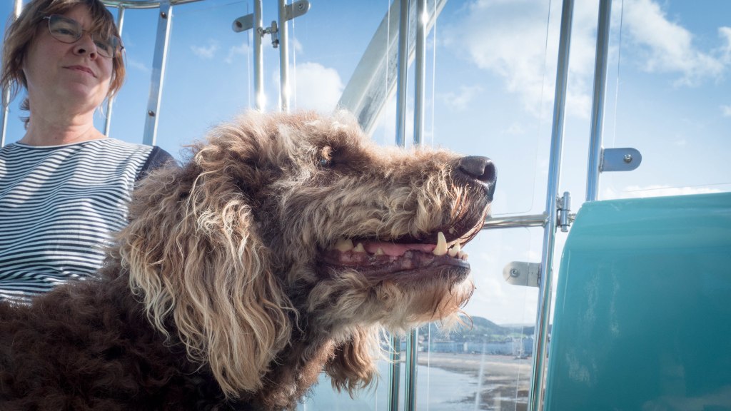 Als wir das Riesenrad am Eingang des Piers passieren, sehen wir ein Schild: dogs welcome. Das lassen wir uns nicht zweimal sagen. Bobbys erste Fahrt im Riesenrad! Wir schauen in den blauen Himmel und über das blaue Meer und im Dunst hinter den Häusern der Stadt erheben sich die Berge des Eryri. Wunderbar.