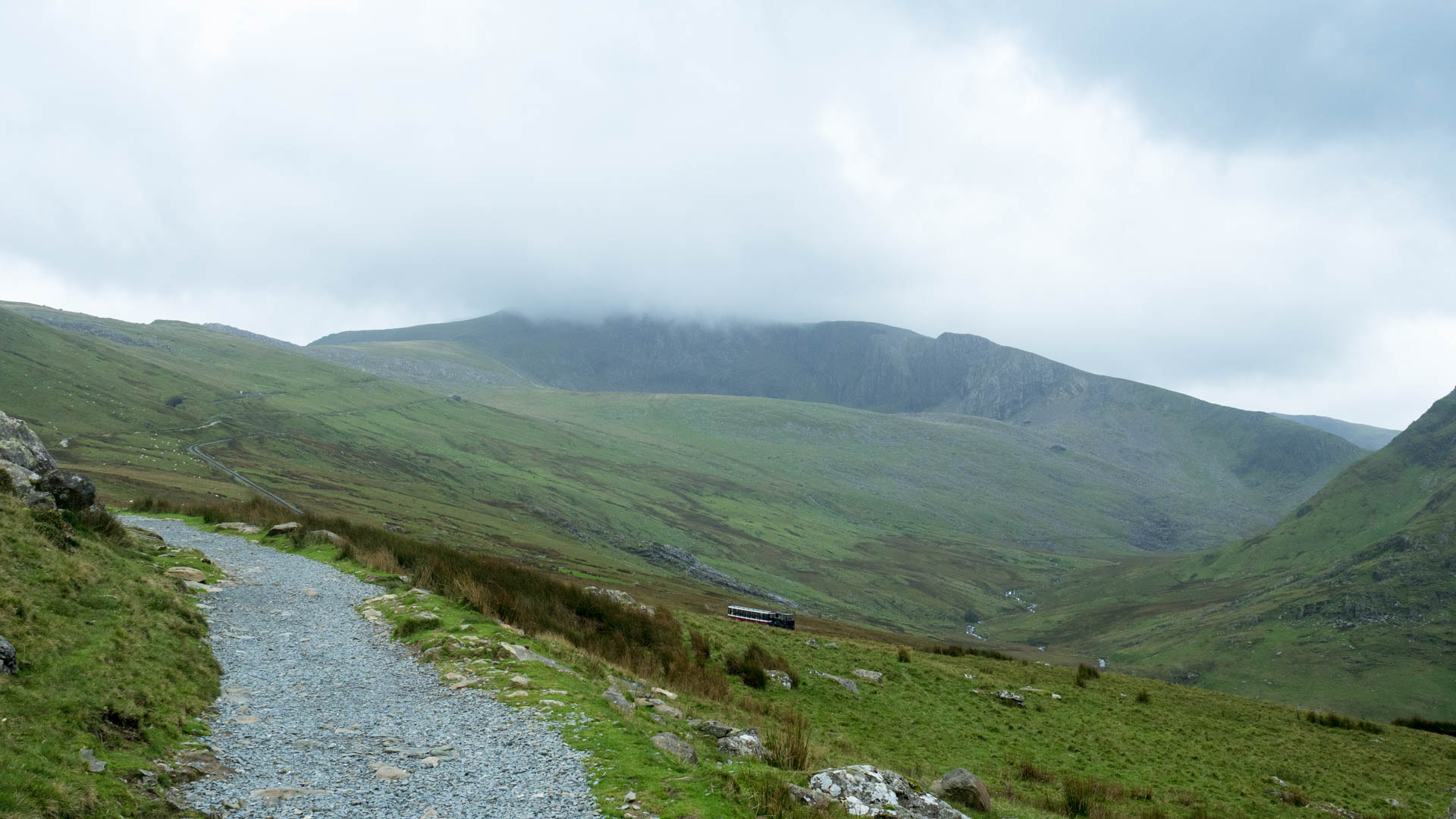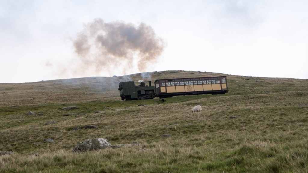 Ein kalter Wind weht über die weiten, grünen Berghänge. Bobby ist damit beschäftigt, die vielen Schafe um uns herum zu fixieren, ich richte meine Kamera unzählige Male auf die Zahnradbahnen, die unseren Weg begleiten und Wolfgang sucht vergeblich einen Blick auf den in dicken Wolken gehüllten Gipfel des Snowdon zu erhaschen. Das Wetter wird immer ungemütlicher und es fängt an zu regnen. Bevor der steile, felsige Abschnitt des Aufstiegs beginnt, drehen wir um. Denn: „Unterschätze nicht den Snowdonia Nationalpark“ 😉